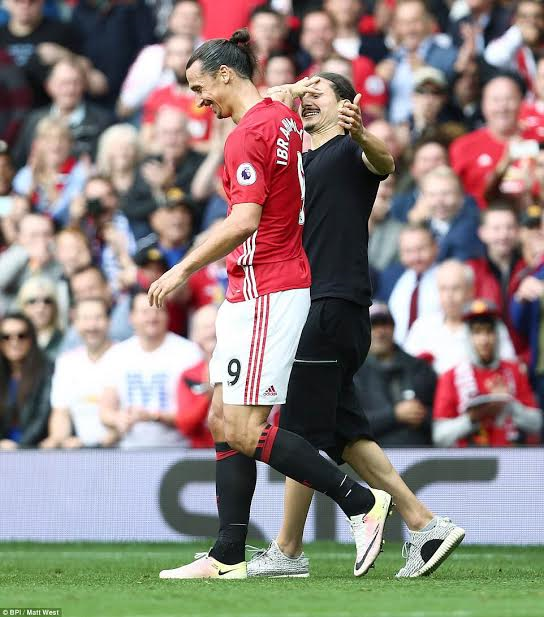It's not every day you come face-to-face with your own lookalike. But that's the story of Man U star player Zlatan Ibrahimovic as he was today confronted by his own look alike pitch invader who ran into the pitch to 'harass' him during Man u's match with Leicester city but the Striker saw the funny side in it and shared a joke with the doppelgänger before he was forced off the pitch by stadium security officials. More photos